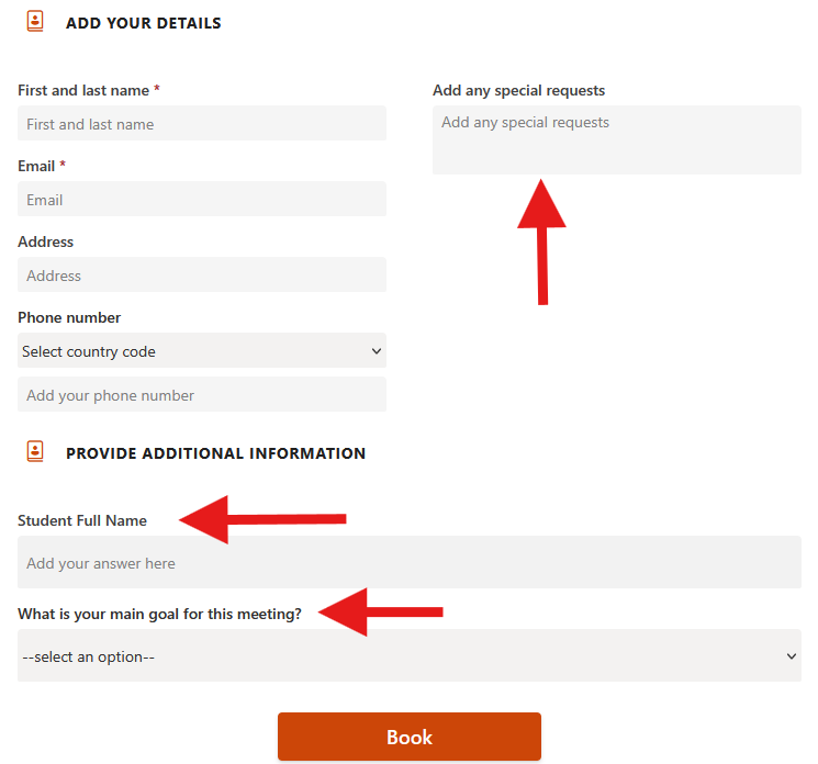 Step 4: Add your name, email (double check your email is accurate to ensure you receive confirmations, links, updates and can make changes), your student’s name, and the main goal for the meeting in the designated fields, provide any additional details in Add any special requests (especially if you chose "other" as a primary goal), then click “Book.”