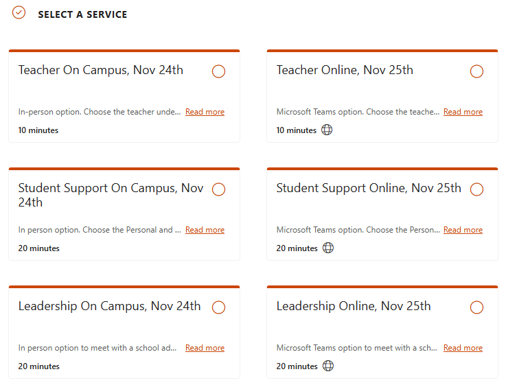 A: In-person teacher and counselor conferences are offered on November 24th. Online conferences with teachers and counselors are offered on November 25th. You can schedule appointments on both days (but not with the same staff member so other parents have the opportunity to meet with teachers and counselors).